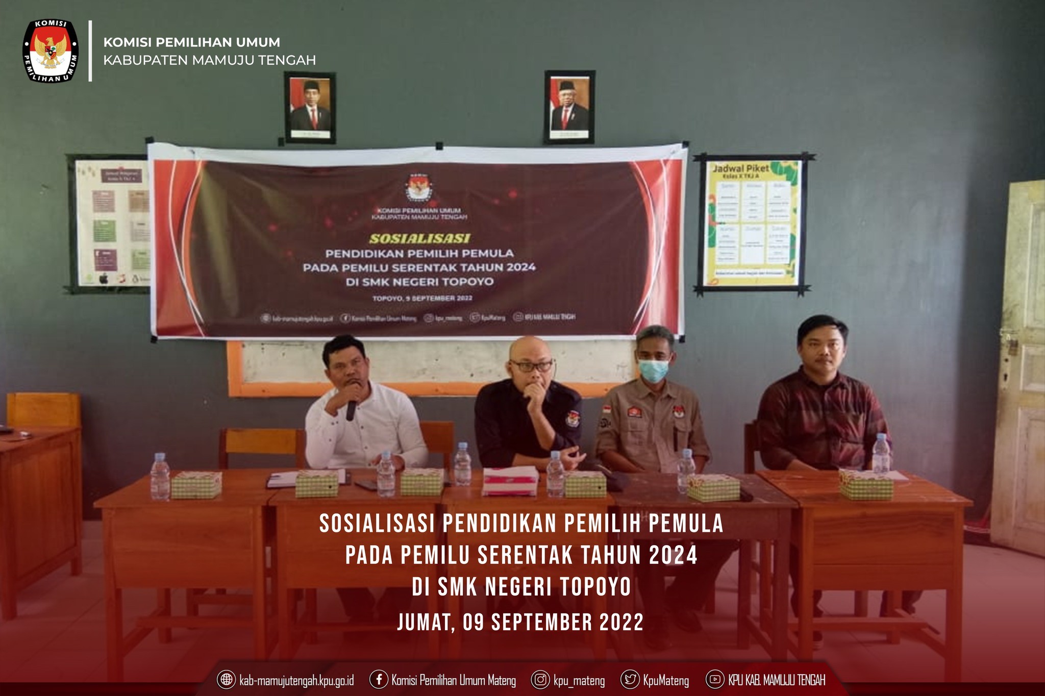 #TemanPemilih KPU Kabupaten Mamuju Tengah melaksanakan Sosialisasi Pendidikan Pemilih Pemula pada Pemilu Serentak Tahun 2024, bertempat di SMK Negeri Topoyo, Jumat (09/09/2022) Materi terkait Pendidikan Pemilih Pemula dibawakan langsung oleh Bapak Sampe Amiruddin selaku Kordiv Sosialisasi, Pendidikan Pemilih, Parmas & SDM KPU Kab. Mamuju Tengah dan Bapak Adi Arwan Alimin selaku Kordiv Sosialisasi, Pendidikan Pemilih, Parmas & SDM KPU Prov. Sulawesi Barat Guna memberikan pemahaman yang komperehensif terkait hak dan kewajiban pemilih dalam pemilu kepada pemilih pemula, KPU Kabupaten Mamuju Tengah mengadakan sosialisasi terkait pelaksanaan Tahapan Pemilihan Umum Tahun 2024. Kegiatan dilangsungkan di SMK Negeri Topoyo, pada Jumat, 09 September 2022. Kegiatan sosialisasi ini sendiri dibuka oleh Sampe Amiruddin selaku Kordiv Sosialisasi, Pendidikan Pemilih, Parmas KPU Kabupaten Mamuju Tengah yang didampingi oleh Adi Arwan Alimin selaku Kordiv Sosialisasi, Pendidikan Pemilih, Parmas & SDM KPU Prov. Sulawesi Barat serta Sekretaris KPU Kab. MAmuju Tengah dan Staf KPU Kabupaten Mamuju Tengah. Dalam sambutan Sampe menjelaskan kepada para peserta bahwa di KPU ada agenda besar yang sedang dilaksanakan, yaitu menyelenggarakan Pemilihan Umum di Tahun 2024 yang tahapannya sudah dimulai dari sekarang dan Pemilihan Gubernur dan Wakil Gubernur. Sebagai penyelenggara, lanjut Sampe, KPU berikhtiar sekuat tenaga untuk menyukseskannya. “Mohon do’a semua untuk kelancaran agenda penting bangsa ini, yaitu pelaksanaan Pemilihan Umum.” pinta Sampe. Sementara Adi Arwan mengingatkan sebagai penyelenggara, KPU Kabupaten Mamuju Tengah menyosialisasikan tahapan demi tahapan Pemilu agar berjalan sesuai dengan regulasi yang telah ditetapkan. “Di antara adik-adik yang ikut sosialisasi ini, banyak yang akan memiliki hak memilih dalam Pemilu nanti, mohon dukungannya untuk ikut menyosialisasikan sepulang dari sini.” kata Adi. #kpumelayani #pemiluserentak2024