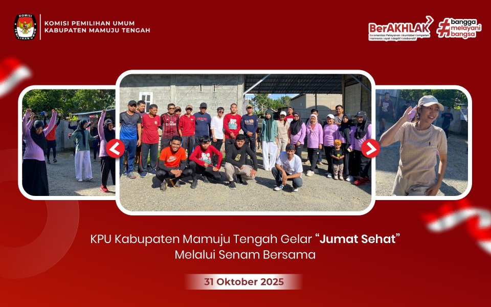 Dalam rangka menjaga kebugaran, meningkatkan imun tubuh, serta mempererat kekompakan antarpegawai, Komisi Pemilihan Umum (KPU) Kabupaten Mamuju Tengah melaksanakan kegiatan “Jumat Sehat” dengan agenda senam bersama pada hari Jumat pagi di halaman kantor KPU Kabupaten Mamuju Tengah.