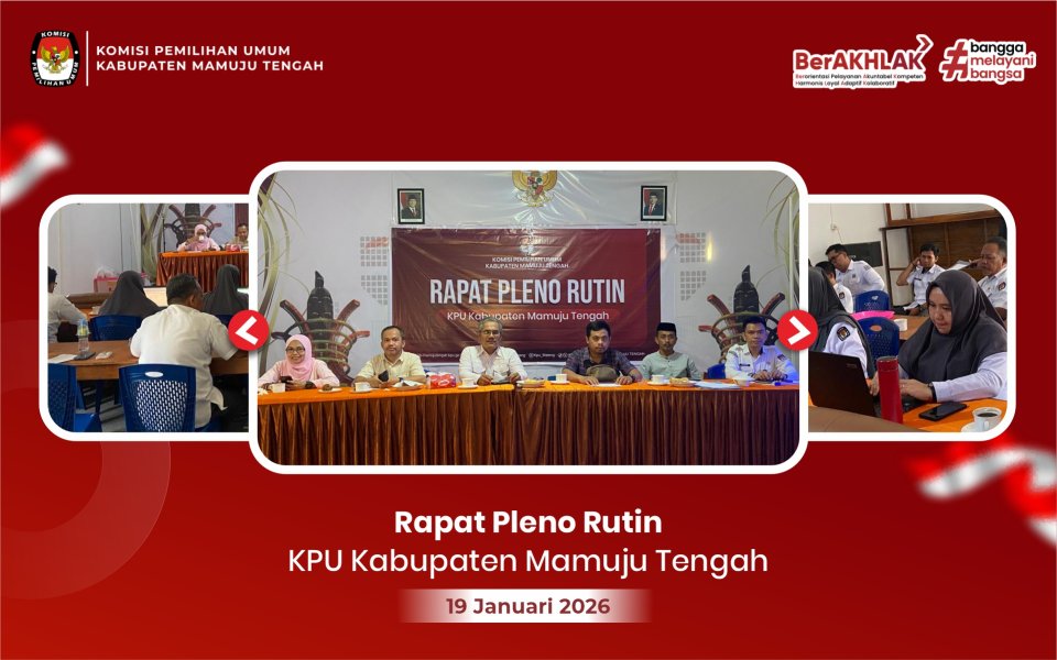 KPU Kabupaten Mamuju Tengah kembali melaksanakan Rapat Pleno Rutin bertempat di Aula Kantor KPU, Senin (19/1/2026). Rapat dipimpin oleh Ketua KPU dan dihadiri oleh Anggota KPU, Kasubag, serta seluruh staf Sekretariat.
