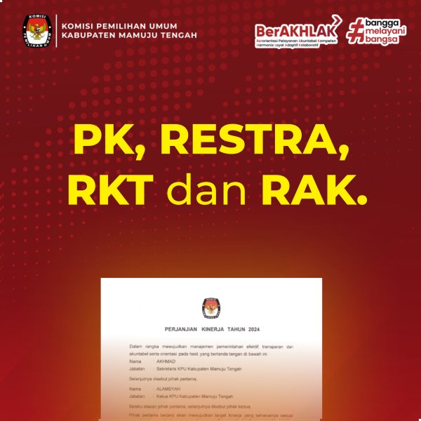 Dalam rangka mendukung manajemen pemerintah efektif transparan akuntabel serta orientasi pada hasil, berikut PK, RESTRA, RKT, dan RAK KPU Mamuju Tengah.
