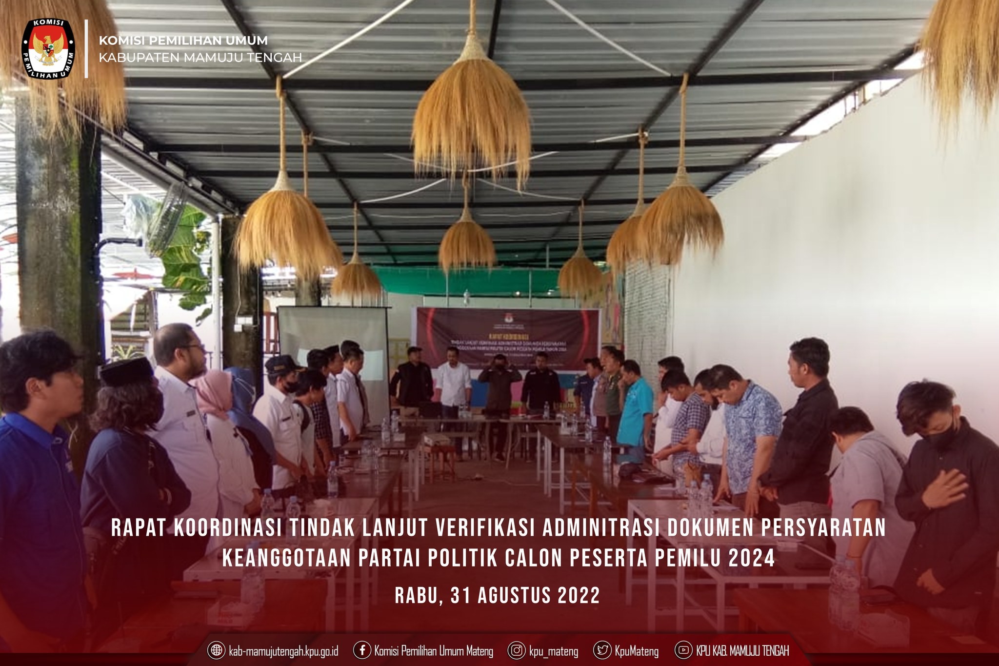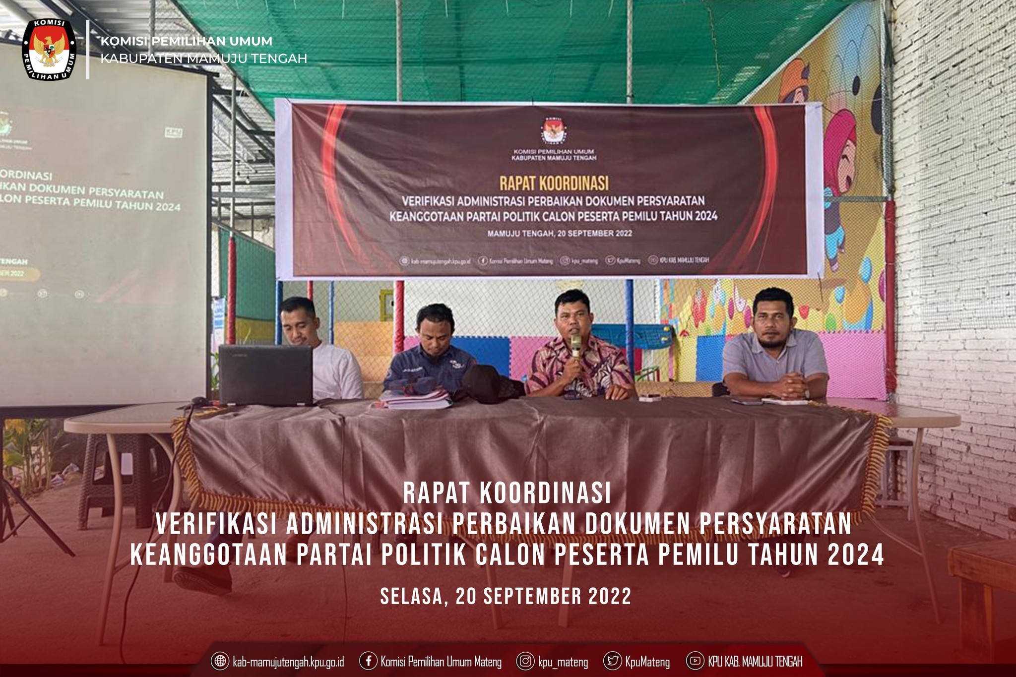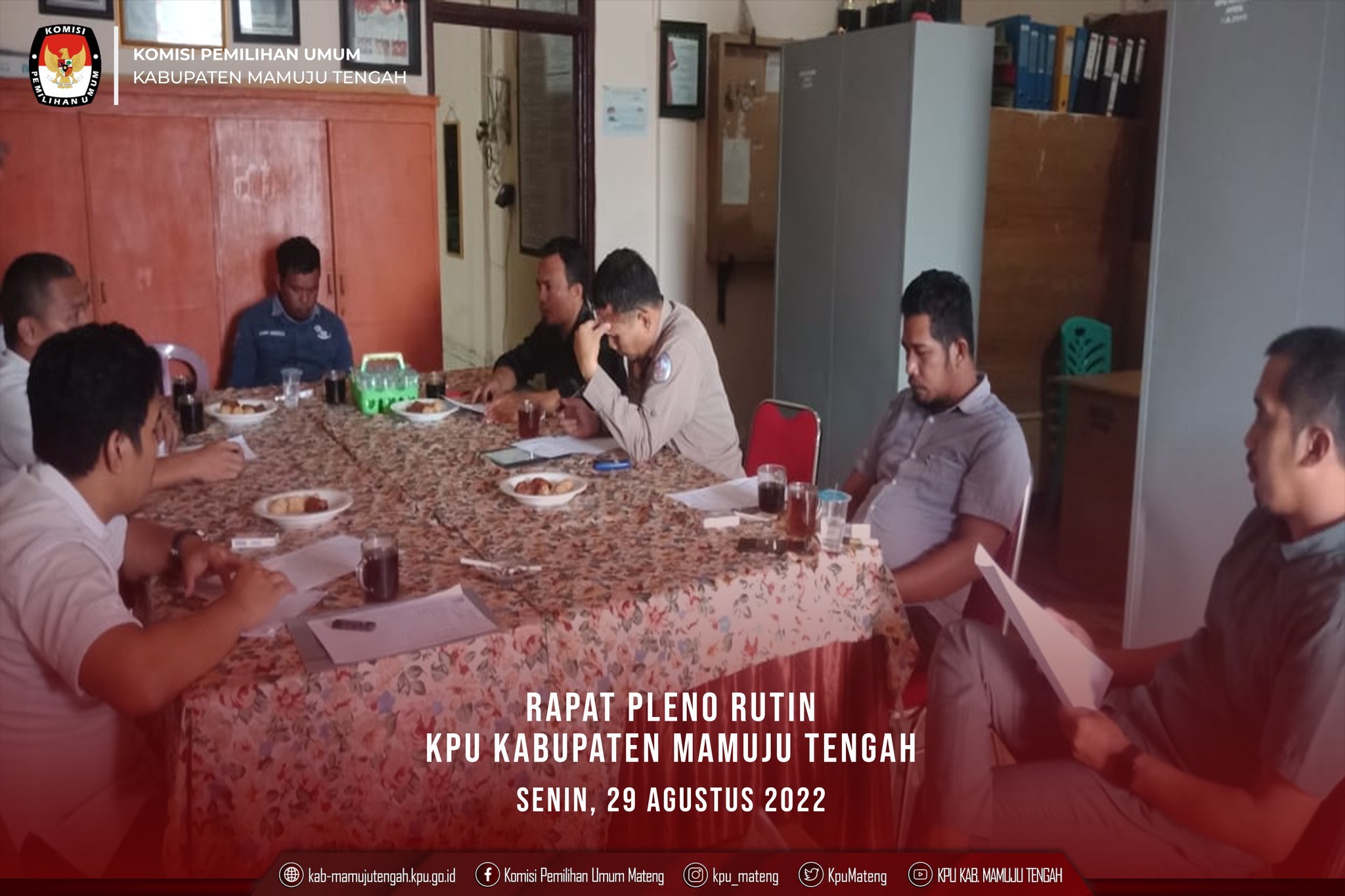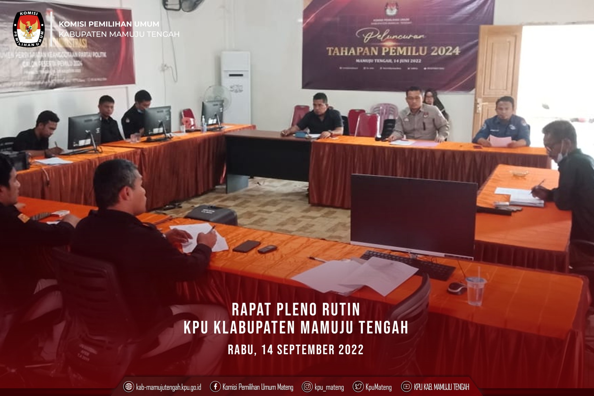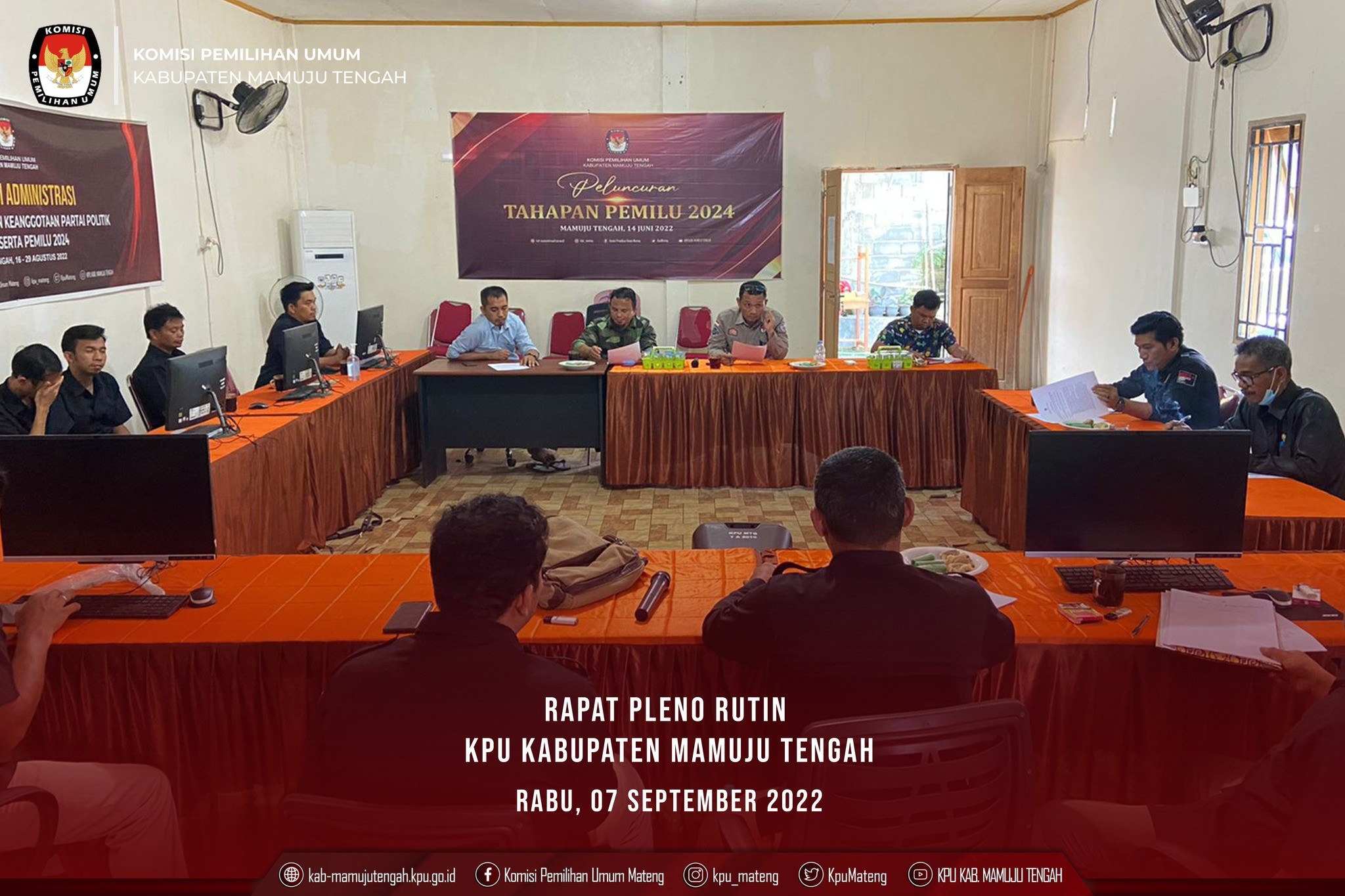 Rapat rutin ini dilaksanakan dalam rangka membahas agenda-agenda kerja KPU Kabupaten Mamuju Tengah, baik yang sedang maupun yang akan dilaksanakan kedepannya. Sekaligus juga acara ini menjadi forum evaluasi atas agenda-agenda kerja yang sebelumnya telah dilaksanakan KPU Kabupaten Mamuju Tengah. Rapat Rutin Mingguan KPU Kabupaten Mamuju Tengah, dilaksanakan Hari Rabu, 14/09/2022 Pukul.14.00 WIB, dengan peserta rapat yaitu, Ketua selaku Pimpinan Rapat, Sekretaris selaku penanggungjawab pelaksanaan rapat, para Anggota dan Kasubag serta staf Sektretariat KPU Kabupaten Mamuju Tengah sebagai para peserta rapat Rutin. Rapat Rutin mingguan ini, akan menghasilkan keputusan-keputusan yang dituangkan dalam Berita Acara yang wajib dilaksanakan dengan penuh tanggung jawab oleh seluruh peserta rapat, baik Ketua, para Anggota (Ketua/Wakil Ketua Divisi), Sekretaris dan Pejabat Fungsional yang merangkap sebagai Kepala Sub Koordinator serta staf Sektretariat KPU Kabupaten Mamuju Tengah. Adapun hasil tindak lanjut keputusan rapat rutin akan dievaluasi pada rapat pleno mingguan selanjutnya.