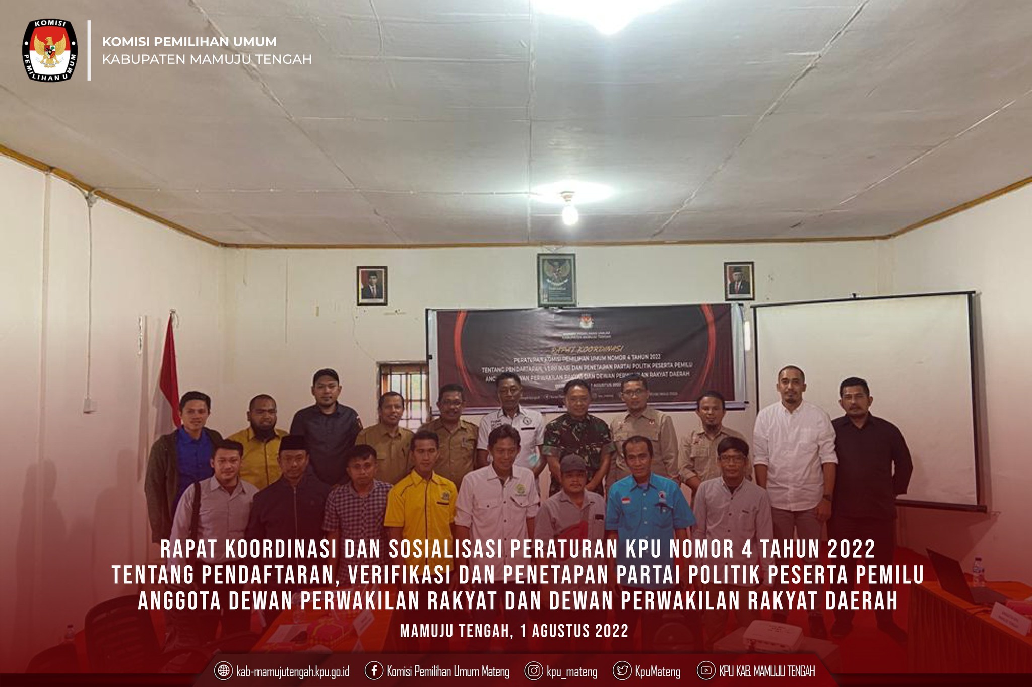 #TemanPemilih, Senin, 01 Agustus 2022, bertempat di Aula Kantor KPU Kabupaten Mamuju Tengah, telah dilaksanakan Rapat Koordinasi dan Sosialisasi PKPU Nomor 4 Tahun 2022 tentang Pendaftaran, Verifikasi dan Penetapan Partai Politik Peserta Pemilihan Umum Anggota Dewan Perwakilan Rakyat dan Dewan Perwakilan Rakyat Daerah