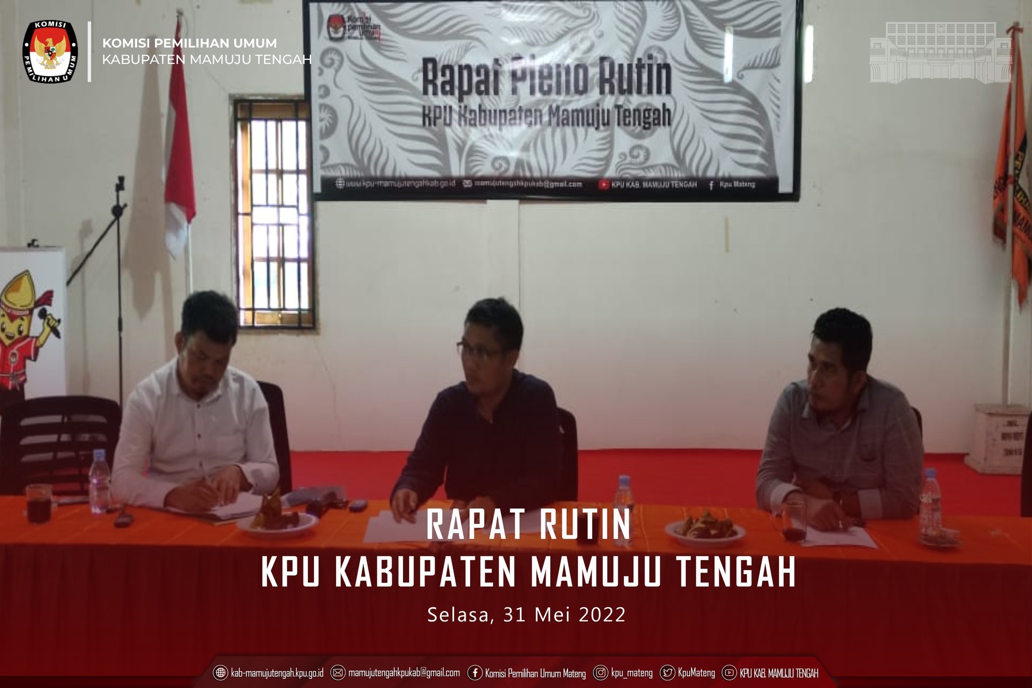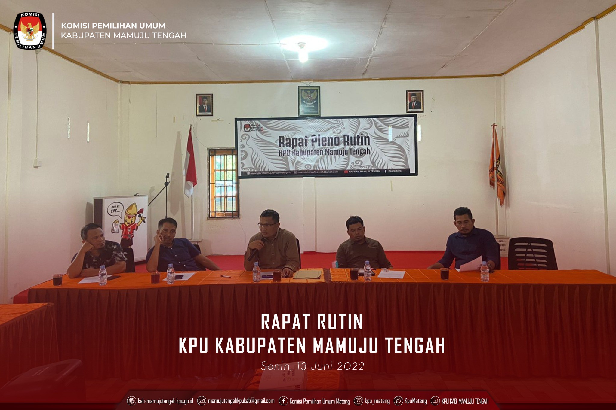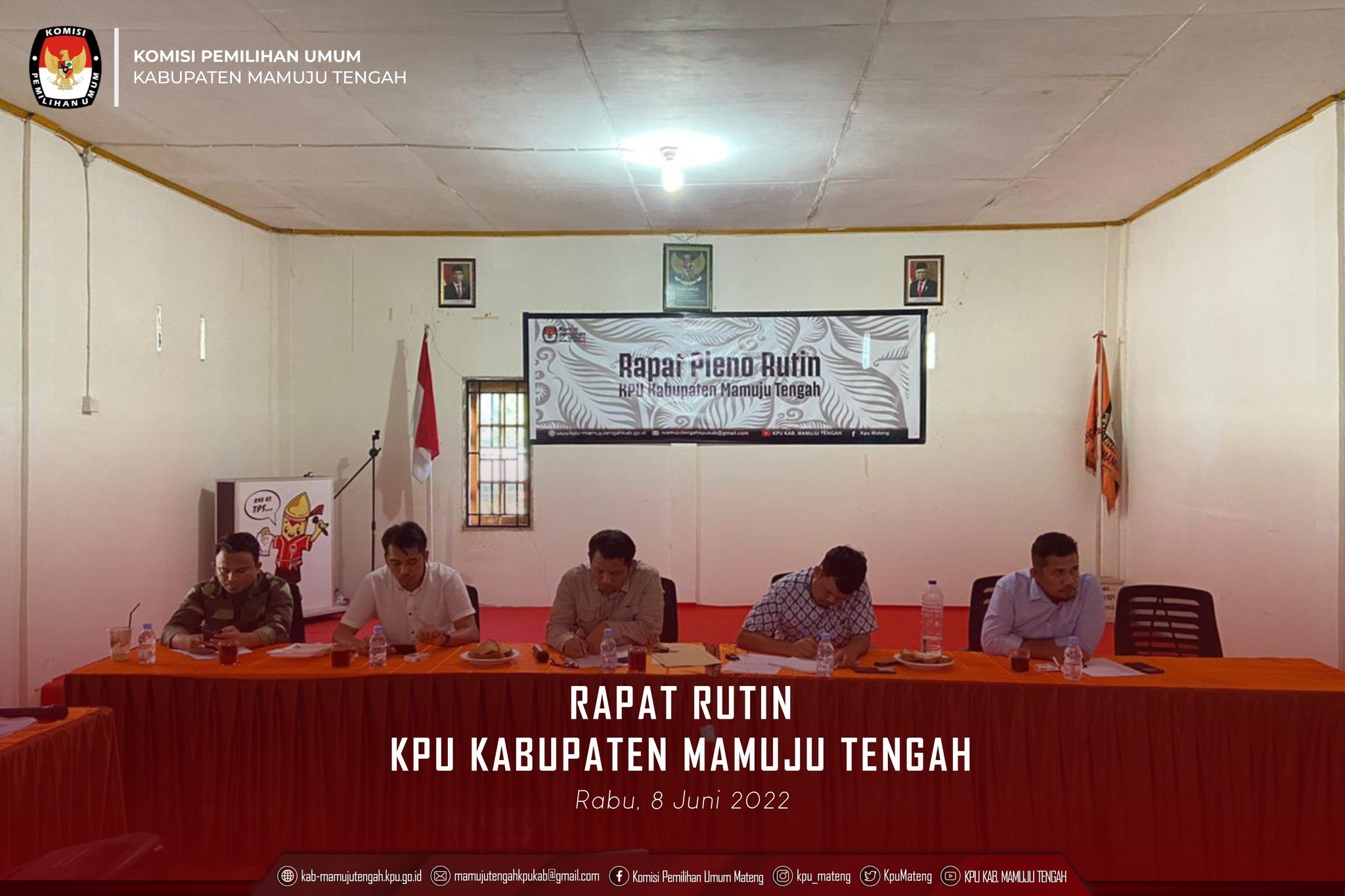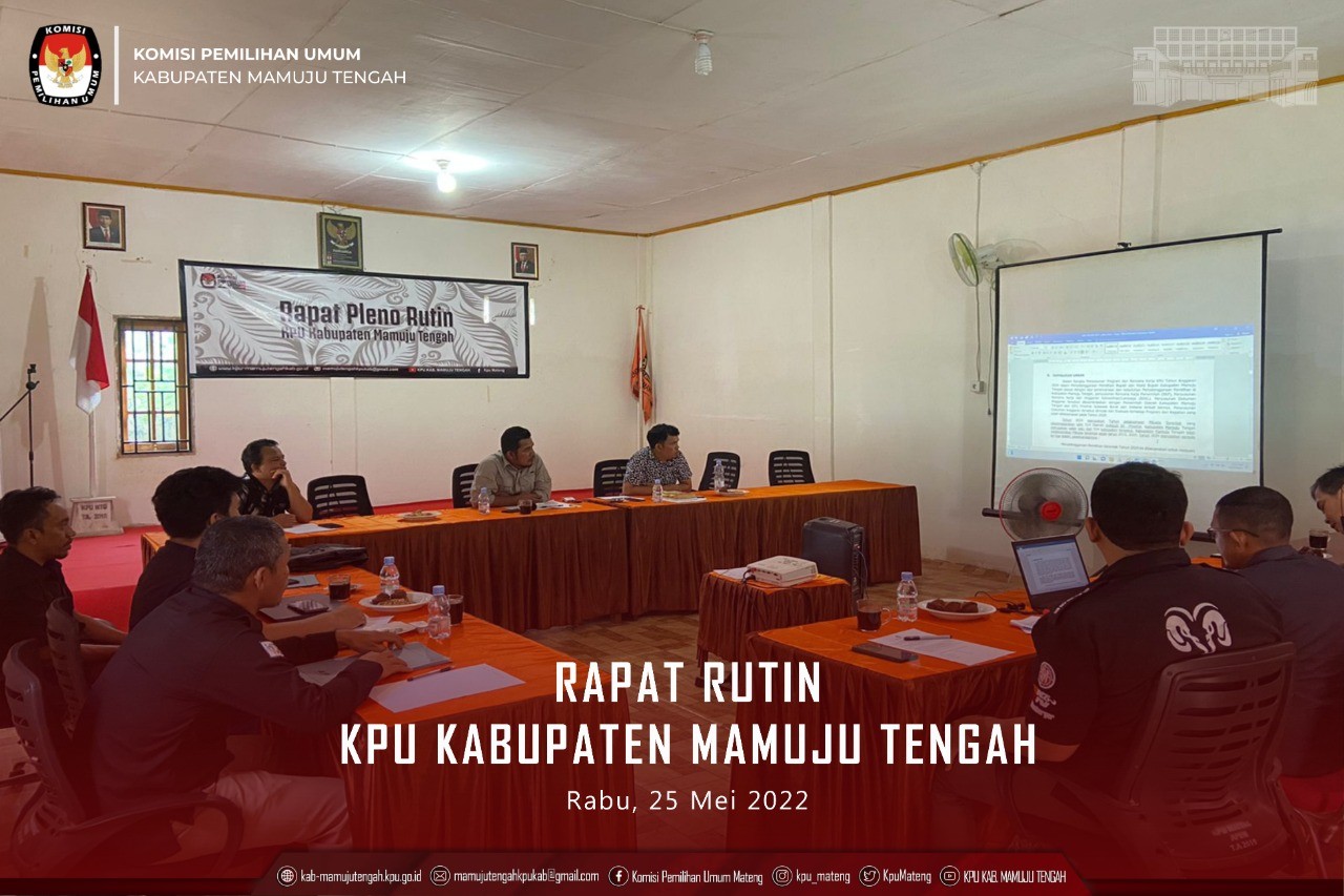Rapat rutin ini dilaksanakan dalam rangka membahas agenda-agenda kerja KPU Kabupaten Mamuju Tengah, baik yang sedang maupun yang akan dilaksanakan kedepannya. Sekaligus juga acara ini menjadi forum evaluasi atas agenda-agenda kerja yang sebelumnya telah dilaksanakan KPU Kabupaten Mamuju Tengah. Rapat Rutin Mingguan KPU Kabupaten Mamuju Tengah, dilaksanakan Hari Rabu, 8/06/2022 Pukul.14.00 WIB, dengan peserta rapat yaitu, Ketua selaku Pimpinan Rapat, Sekretaris selaku penanggungjawab pelaksanaan rapat, para Anggota dan Kasubag serta staf Sektretariat KPU Kabupaten Mamuju Tengah sebagai para peserta rapat Rutin. Rapat Rutin mingguan ini, akan menghasilkan keputusan-keputusan yang dituangkan dalam Berita Acara yang wajib dilaksanakan dengan penuh tanggung jawab oleh seluruh peserta rapat, baik Ketua, para Anggota (Ketua/Wakil Ketua Divisi), Sekretaris dan Pejabat Fungsional yang merangkap sebagai Kepala Sub Koordinator serta staf Sektretariat KPU Kabupaten Mamuju Tengah. Adapun hasil tindak lanjut keputusan rapat rutin akan dievaluasi pada rapat pleno mingguan selanjutnya.